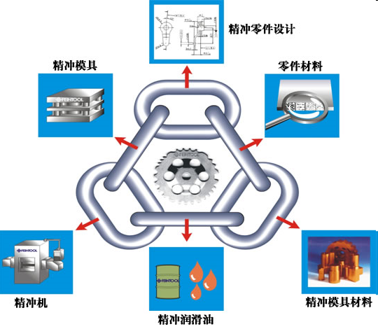 一个完整的精冲生产线包括板材精冲、零件磨削、清洗、成品的防锈,以及精冲模具制造加工。